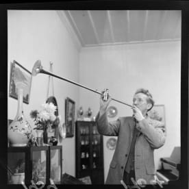 Ron Castle holding a trumpet. Negatives of the Evening Post newspaper. Ref: EP/1959/1704-F. Alexander Turnbull Library, Wellington, New Zealand. http://natlib.govt.nz/records/23504000olding a trumpet