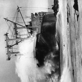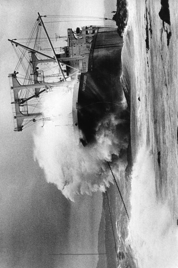 A wave breaks over the bow of the Pacific Charger. The 10,000-ton bulk carrier hit rocks at Baring Head near the entrance to Wellington Harbour on 21 May 1981.