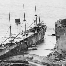 The largest vessel to date wrecked on the coast of the South Island, the Tyrone struck on the rocks just south of Otago Heads early in the morning of 27 September 1913. The primary cause was put down to heavy fog, which capping the land, obscured the light on Taiaroa Head, and rendered it impossible to determine the direction of the fog signals that were heard from the lighthouse. She eventually settled, broadside, on Wahine Point and before long the pounding sea pushed her onto the rocks and the hull broke in two.