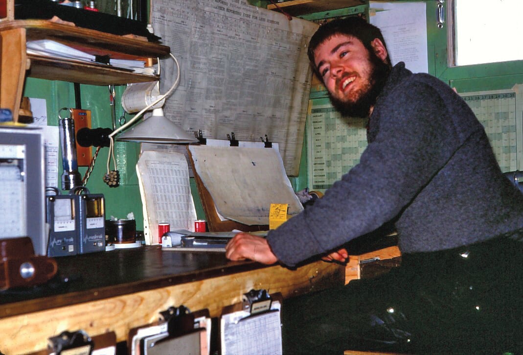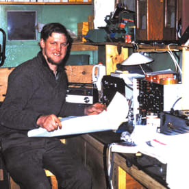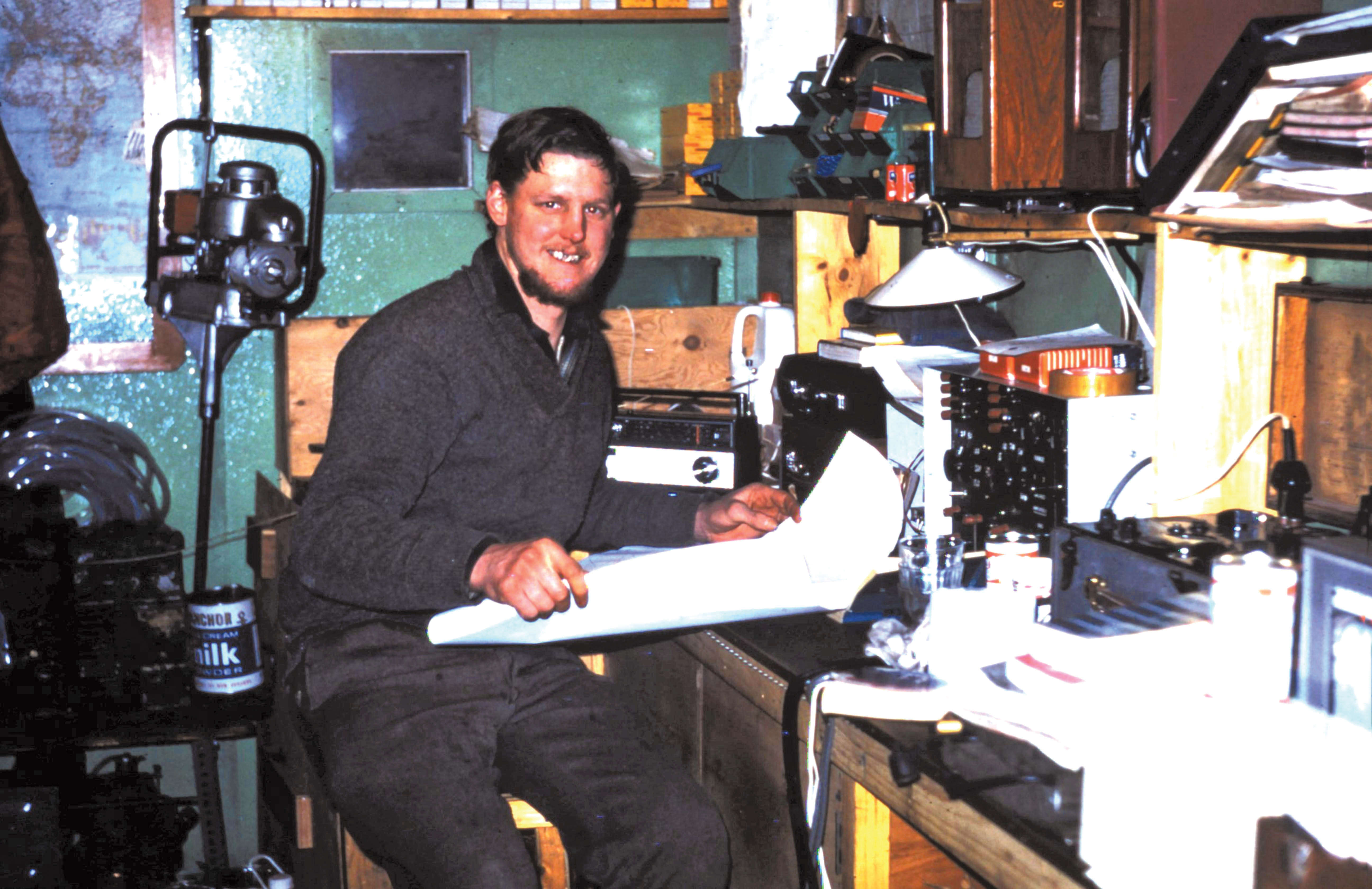 Simon in the laboratory reviewing his seismic chart. From left to right: an ice drill, an Anchor milk can, the Sony radio, and an assemblage of recorders and instruments (PHOTO: Supplied)