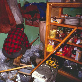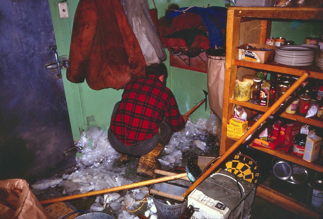 Warren chips and removes ice accumulated at floor level from inside near the entrance of the main hut (PHOTO: Bill Lucy)