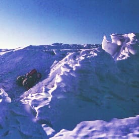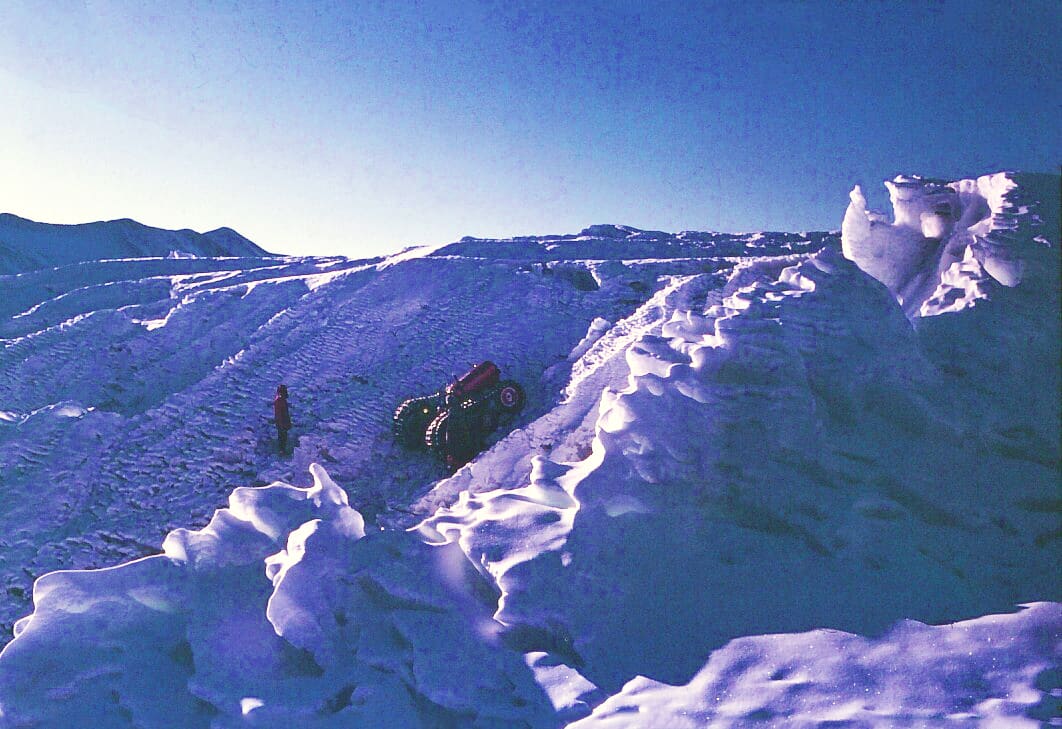 Winching the tractor up a navigable portion of the edge of the Wright Lower Glacier on the second attempt to reach the Bay of Sails, 16 March (PHOTO: Bill Lucy)
