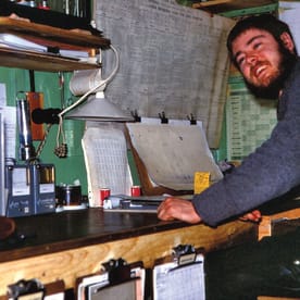 Al in the laboratory reviews the record from the Mount Odin wind station (PHOTO: Bill Lucy)