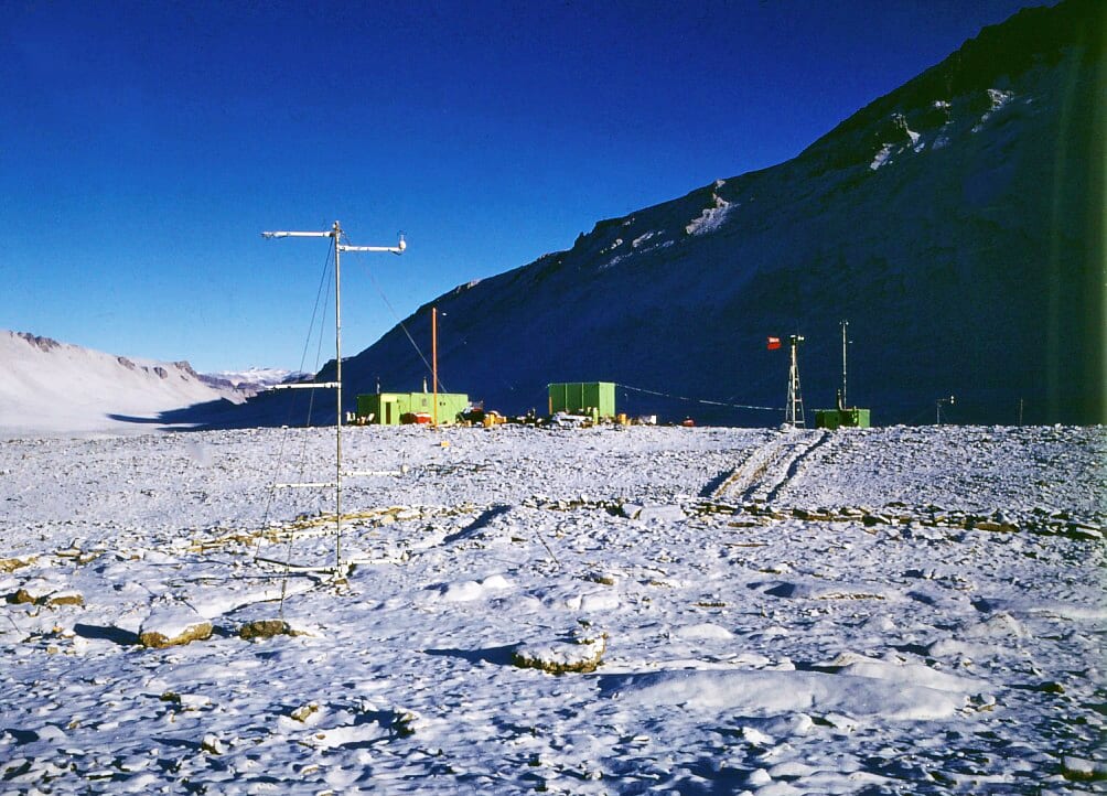 Vanda Station after light snowfall. Buildings (from left to right): main hut, food hut and laboratory. The meteorological mast is in the foreground, with Mount Fleming on the horizon and the shadowy slopes of the Olympus Range to the right (PHOTO: Bill Lucy)