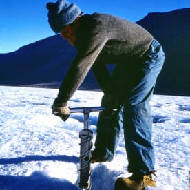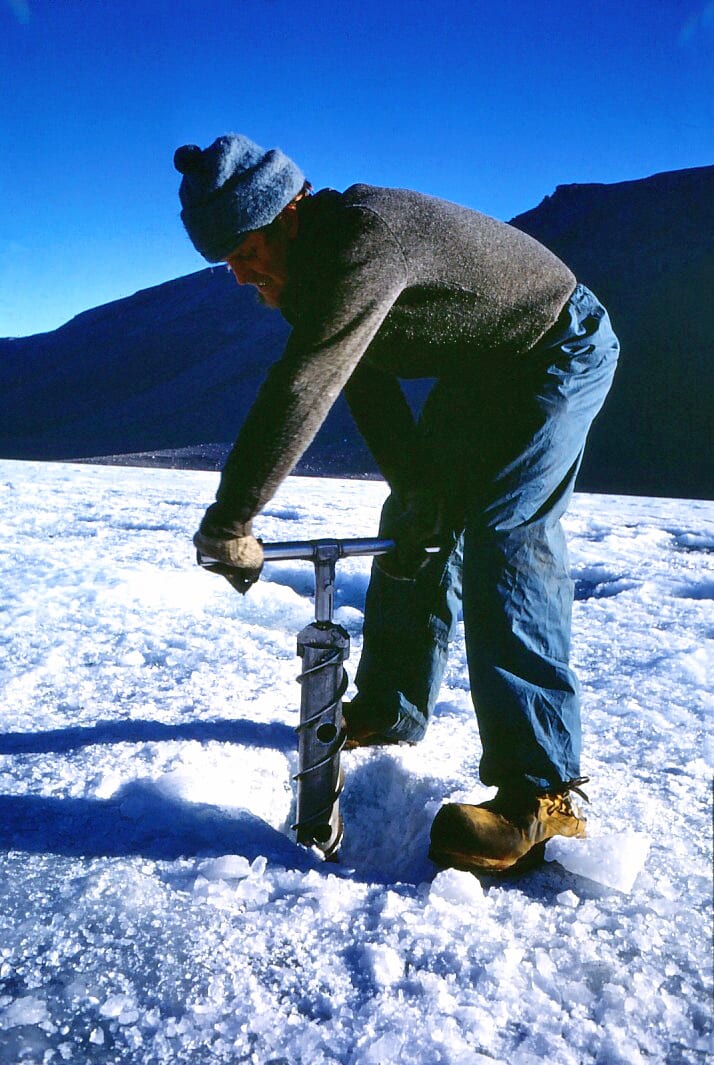 Simon drills the lake surface with the Cipre drill (PHOTO: Bill Lucy)