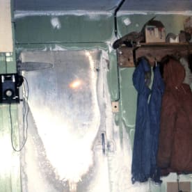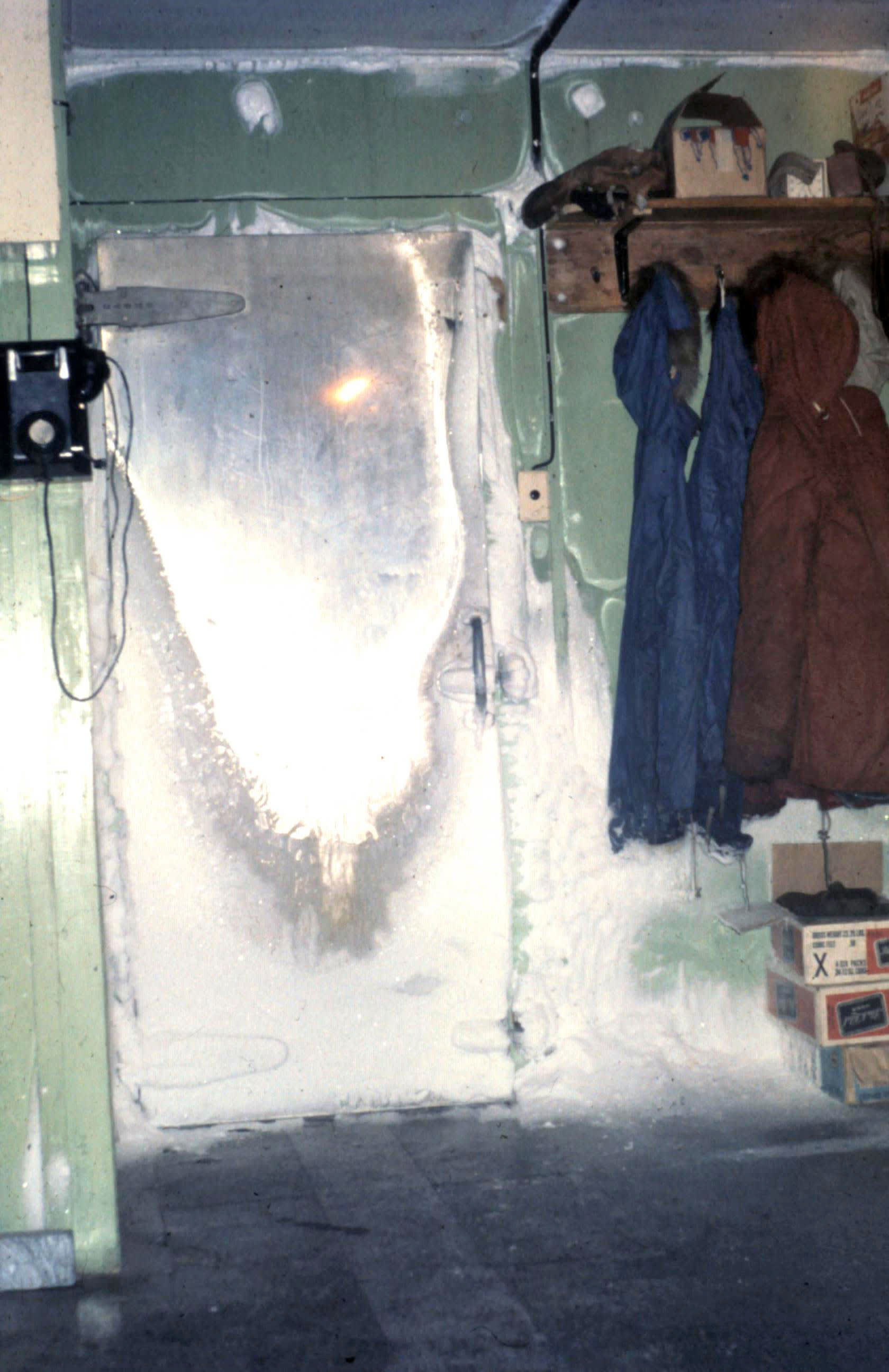 Ice inside the entrance door to the main hut. Note the telephone mounted on the wall to the left. (PHOTO: Supplied)