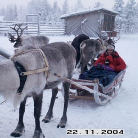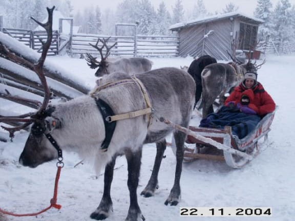Trish and her son, Lucas with a reindeer in Rovaniemi, Finland.