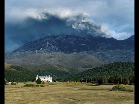 Mt Ruapehu during an eruption with the Chateau in the foreground.