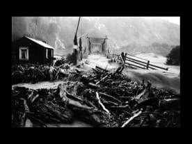 Flood debris alongside the bridge over the Mohaka River, April 1938. Photographer unidentified. On the back of the picture is inscribed: The earthquake [1931?] dammed a creek & formed Te Hoe Lake 5 miles long & 260 ft deep - it rose 10 ft a day when being formed. In the flood it burst through & disappeared down the Mohaka River & this bridge is the one on the main road from Napier to Wairoa where the Mohaka River is crossed not far below the big new Mohaka viaduct. When lots of logs got through one side of the bridge they & the water came along the bridge towards Wairoa side. The river rose quickly 40 ft. Do you wonder this wooden bridge gave way? Reference number: PAColl-0102-01 Permission of the Alexander Turnbull Library, National Library of New Zealand, Te Puna Matauranga o Aotearoa must be obtained before any reuse of this image.