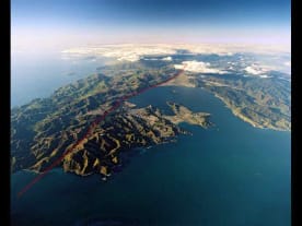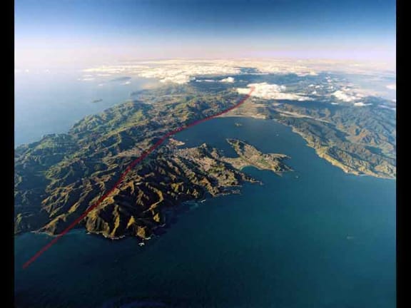 Extending northwards from Cook Strait (lower left), the active Wellington Fault cuts across the Wellington region and along the western edge of Wellington Harbour and the Hutt Valley.