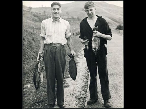 Two men holding fish stranded by the tsunami that hit the coast north of Gisborne on the 26th of March 1947. Photographed by Harold J Dunstan. On the back of the picture is inscribed: Tidal wave damage - Gisborne. Many fish were left stranded and many residents ..... These fish were found well above water mark. P 9/4/47. H J Dunstan Box 233 Gisborne. Reference number: PAColl-0785-1-159-02 Permission of the Alexander Turnbull Library, National Library of New Zealand, Te Puna Matauranga o Aotearoa must be obtained before any reuse of this image.