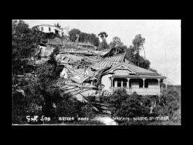 Building demolished by the 1931 Hawke's Bay earthquake, and a house, still standing, alongside. Photographer unidentified. Reference number: 1/2-060933-F Permission of the Alexander Turnbull Library, National Library of New Zealand, Te Puna Matauranga o Aotearoa must be obtained before any reuse of this image.