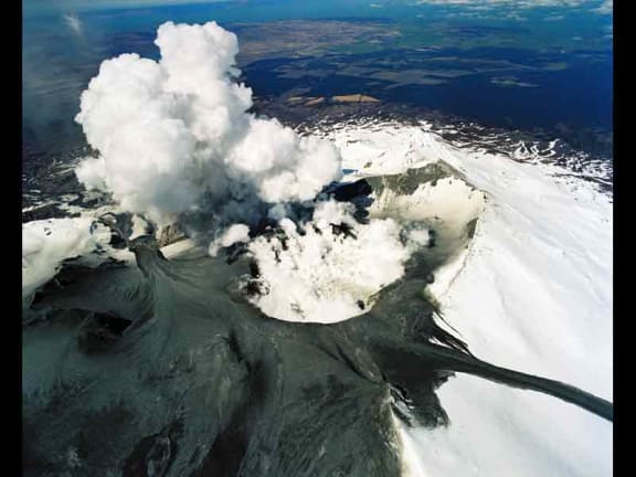 Mt Ruapehu with the path of a lahar streaming off to the right.