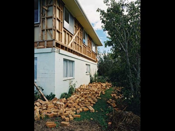 A house loses its bricks during an earthquake.