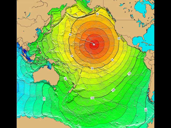 Estimated arrival times for a tsunami generated in Hawaii.
