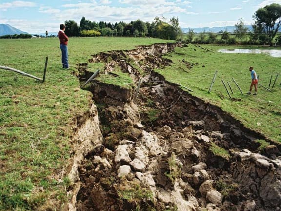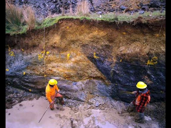 Two scientists looking at a cut-away of the fault line in Kaitoki.