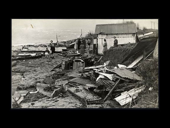 The wreckage of Mr and Mrs A F Hall's house at Pouawa, destroyed by a tsunami on the 26th of March 1947. Photographed by Harold J Dunstan. Published in the New Zealand Free Lance on the 9th of April 1947. On the back of the picture is inscribed: Tidal wave. Remains of Mr Hall's place. Post standing in kitchen in which he, wife, and friend were trapped. This was slewed round. Three other rooms demolished. P 9/4/47. Dunstan ass. Reference number: PAColl-0785-1-159-01 Permission of the Alexander Turnbull Library, National Library of New Zealand, Te Puna Matauranga o Aotearoa must be obtained before any reuse of this image.