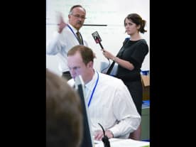 Radio New Zealand reporter Lucy Cleary hard at work during Exercise Ruaumoko.
