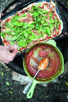 While it’s getting hot you can make a batch of sauce for the pizza. Rest a heavy-bottomed pan over the coals and add the olive oil. Once it’s hot, toss in the garlic and let it sizzle for about 30 seconds. Add the pepper and give it a stir, then tip in the tomatoes and give them a mash with the back of a fork. Cook for about 5–10 minutes until it thickens up a bit, then season to taste and add the fresh herbs. Keep nice and hot while you cook the pizza base.