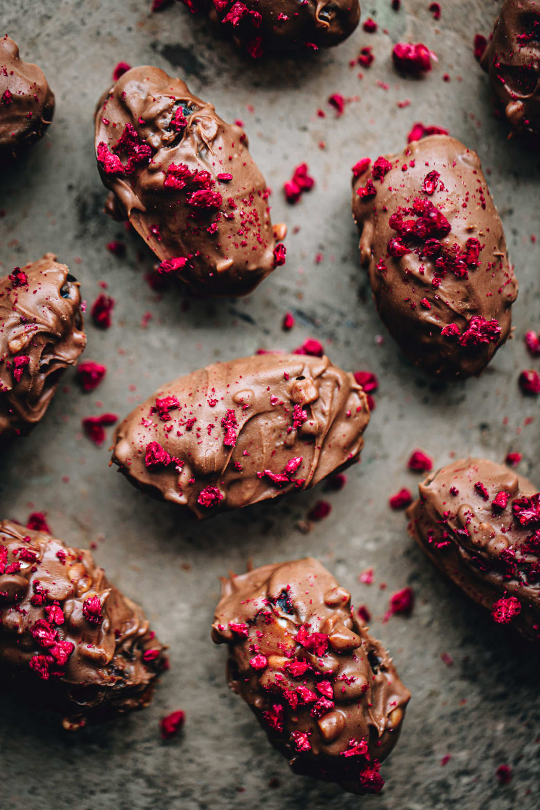 Using a pair of tweezers or tongs, dip each date in the chocolate mixture and place on a wire rack until set. Sprinkle with the dried raspberries and refrigerate until ready to eat.