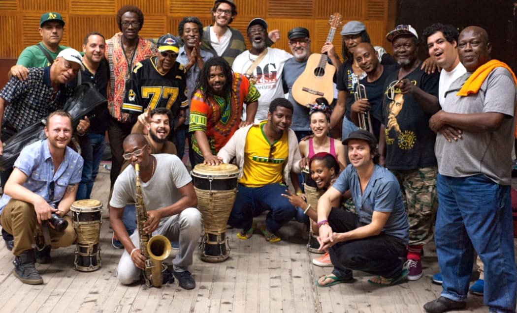 The 14-piece band features a number of Jamaican musicians, including the heavy weight and globally respected rhythm section Sly and Robbie, mixing it up with several Cuban musicians with links to the Buena Vista Social Club.