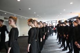 Students from a Christ's College and St Margaret's College combined choir called Collegium being interviewed. Photo RNZ/Rebecca Blundell.