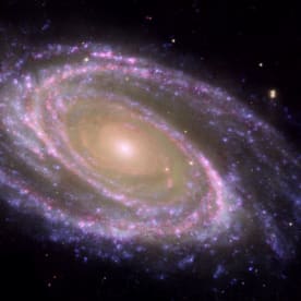 Bode's Galaxy M81: This galaxy is tilted at an oblique angle on to our line of sight, giving a birds-eye view of the spiral structure. The galaxy is similar to our Milky Way, but our favourable view provides a better picture of the typical architecture of spiral galaxies. M81 may be undergoing a surge of star formation along the spiral arms due to a close encounter it may have had with its nearby spiral galaxy NGC 3077 and a nearby starburst galaxy (M82) about 300 million years ago. M81 is one of the brightest galaxies that can be seen from the Earth. It is high in the northern sky in the circumpolar constellation Ursa Major, the Great Bear. www.nasaimages.org