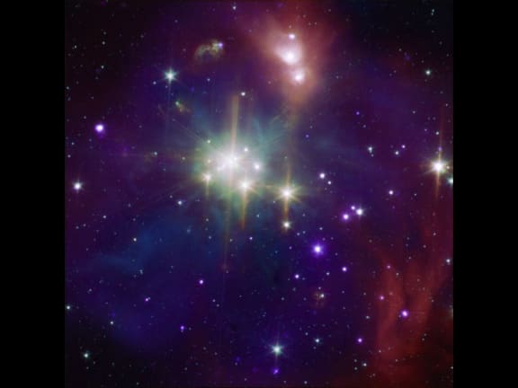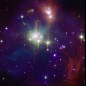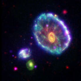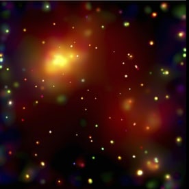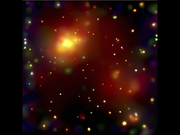 The galaxy cluster Abell 2125. Several massive multimillion degree Celsius gas clouds appear to be in the process of merging. Ten of the point-like sources are associated with galaxies in the cluster and the rest are probably distant background galaxies. The bright gas cloud on the upper left is the core of the cluster and envelopes hundreds of galaxies. www.nasaimages.org