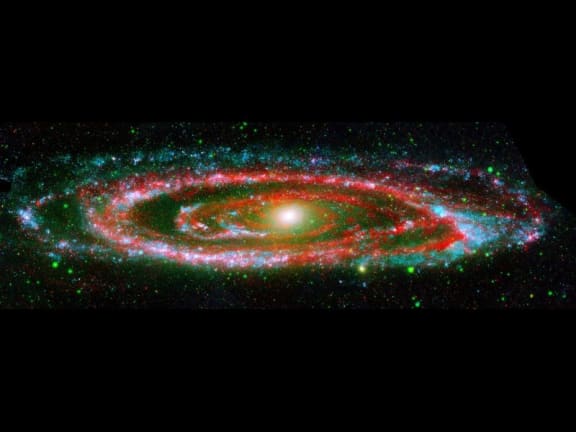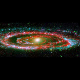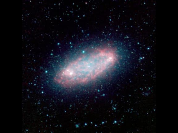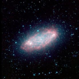 Galaxy NGC 2976, located approximately 10 million light-years away in the constellation Ursa Major near the Big Dipper. Unlike other spiral galaxies where the star-forming and dusty regions highlight spiral arms, this galaxy has a rather chaotic appearance. As the "glowing" red emission maps out, Spitzer is able to pierce through dense clouds of gas and dust that comprise the spiral disk, revealing new star formation that is driving the evolution of the galaxy. www.nasaimages.org