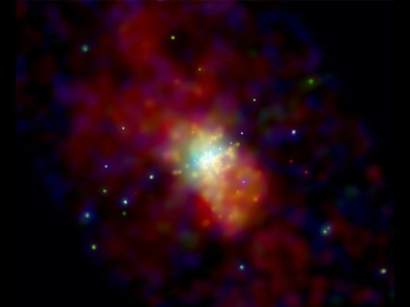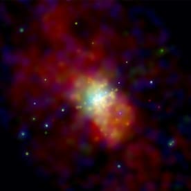 Gas has been heated to millions of degrees by the violent outflow of matter blasting out of this galaxy. The eruption can be traced back to the central regions of the galaxy where stars are forming at a furious rate, some 10 times faster than in the Milky Way Galaxy. Many of these newly formed stars are very massive and race through their evolution to explode as supernovas. Vigorous mass loss from these stars before they explode, and the heat generated by the supernovas drive the gas out of the galaxy at millions of miles per hour. It is thought that the expulsion of matter from a galaxy during bursts of star formation is one of the main ways of spreading elements like carbon and oxygen throughout the universe. www.nasaimages.org