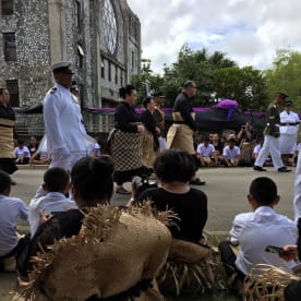 Thousands of children lined the roadsides of the 20km stretch leading from the airport to the royal palace. In Tongan tradition commoners are forbidden to be upstanding near or around the presence of Royal family members, so the children sat on the ground with their heads bowed in respect as the cortege passed by.