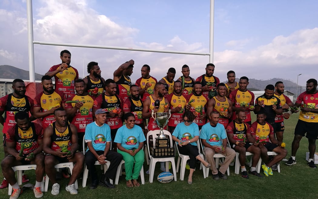 The PNG Hunters squad pose with the Intrust Super Cup trophy in Port Moresby. Photo: RNZI/Melvin Levongo