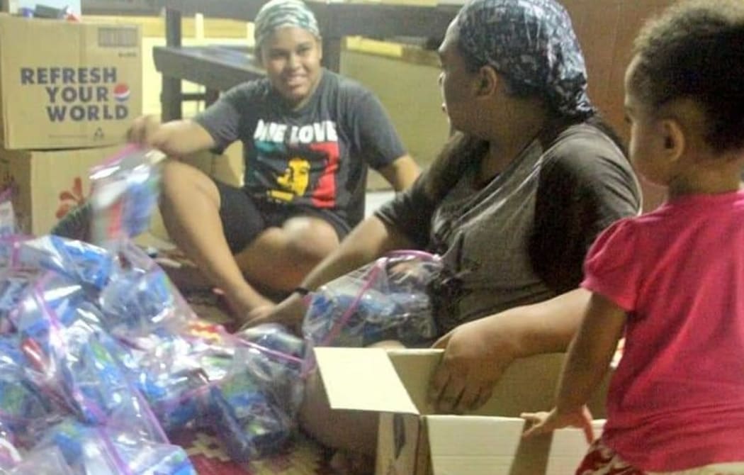 Faith, AnnMary and Eunice Raduva pack the dignity kits. Photo: Supplied/AnnMary Raduva