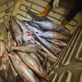 A yellowfin tuna is hauled on board the fishing vessel Shuen De Ching. Photo/ Paul Hilton.
