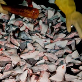 Shark tails found in the freezer of the Shuen De Ching No.888. Greenpeace says they counted 620 fins and 42 tail fins in the holds when they boarded. Photo/ Paul Hilton