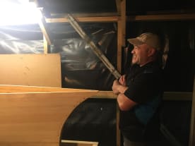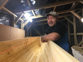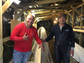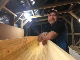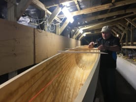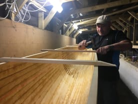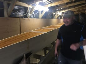 John Misky's dad sanding back the cedar cladding of the vaka.
