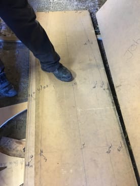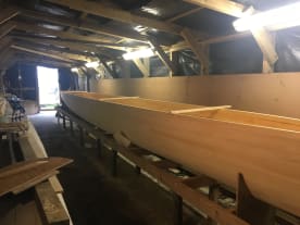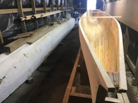 John Misky contemplating the application of fibreglass to the vaka hull.