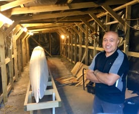 John Misky inside his Cannon's Creek shed at home in Porirua with the polystyrene model of the vaka hull.