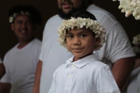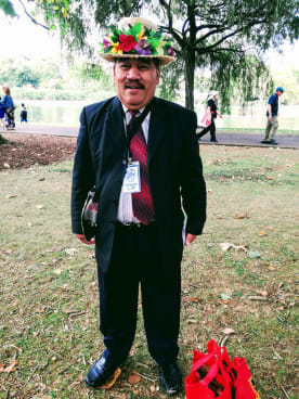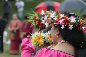 Reverend William Hakaoro, the official minister for the Cook Islands village dressed in his Sunday best and wearing a pare rito (his island hat). Photo: RNZ/ Indira Stewart