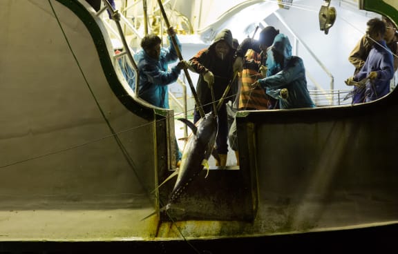 A yellowfin tuna is hauled on board the fishing vessel Shuen De Ching. Photo/ Paul Hilton.