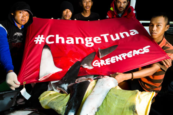 Greenpeace approaches the longline vessel Shuen De Ching No 888 which the organisation says offloaded its catch to another ship to avoid monitoring mechanisms. Photo/ Paul Hilton