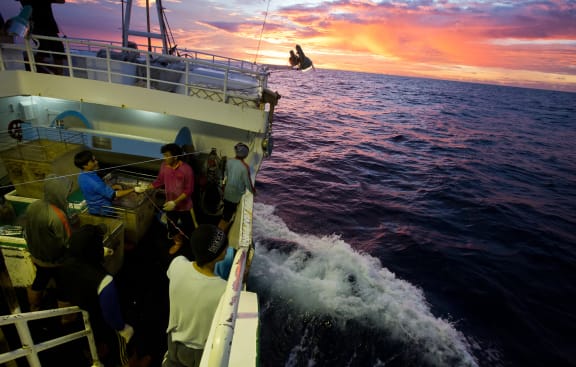 The Nauru government says it banned transhipments following the Greenpeace bust. Transhipments allows a longliner to offload its catch to a bigger mother ship out at sea and avoid monitoring measures at ports. Pictured are the crew on the Shuen De Ching. Photo/ Paul Hilton