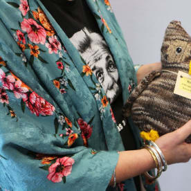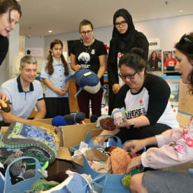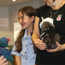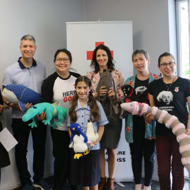 Handing the knitted critters over to the Red Cross who will put them into their packs for new refugee and migrant families who stay at the Mangere Refugee Resettlement Centre