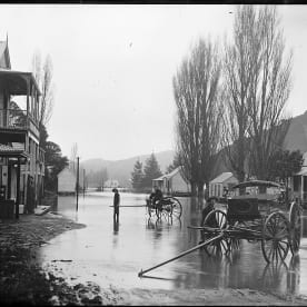 View of carriages in a flooded street in Kaeo, Northland, also showing buildings and houses surrounded by flood waters. Photograph taken circa 1910s by Arthur James Northwood. Ref: 1/1-005719-G. Alexander Turnbull Library, Wellington, New Zealand