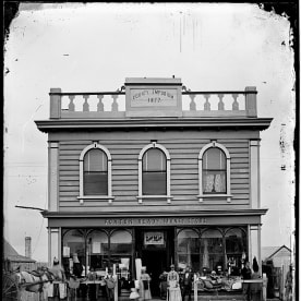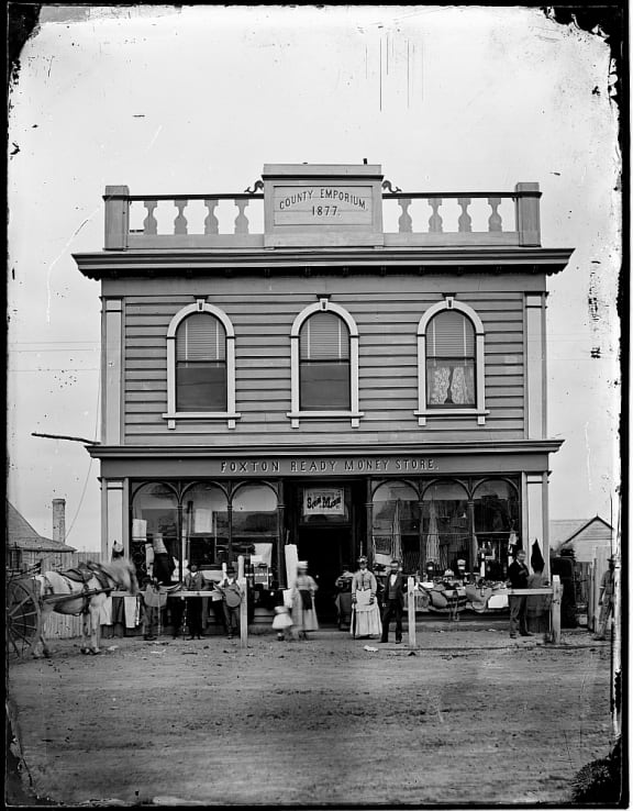 [ca 1878] Foxton Ready Money Store, County Emporium, Foxton. Harding, William James, 1826-1899 :Negatives of Wanganui district. Ref: 1/1-000308-G. Alexander Turnbull Library, Wellington, New Zealand.
