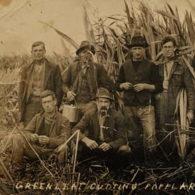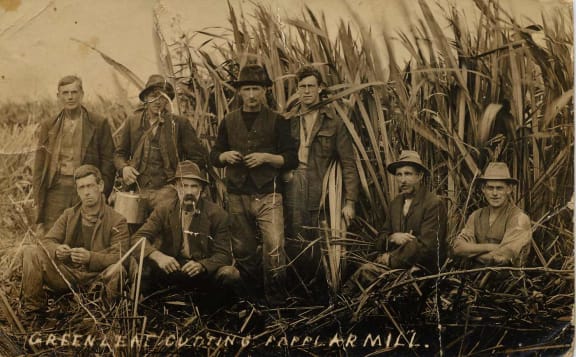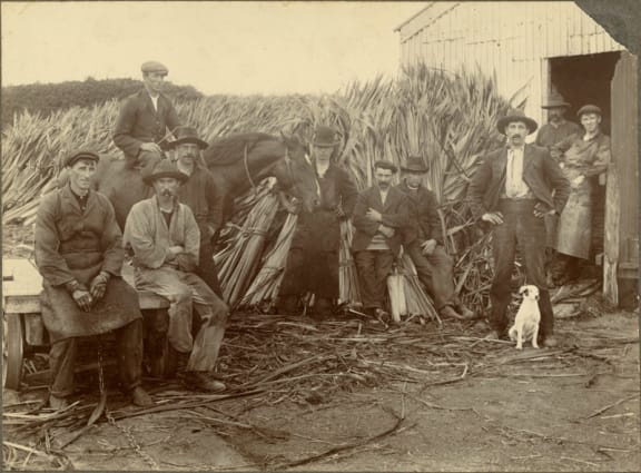 Poplar flaxmill cutters pose in front of a stand of flax c.1919. Image: Foxton Historical Society