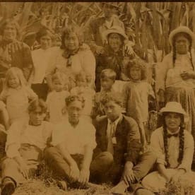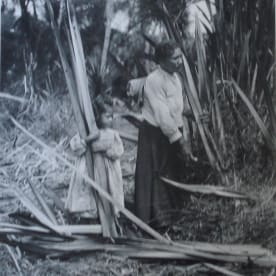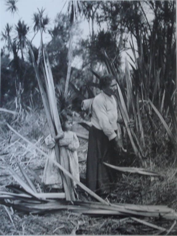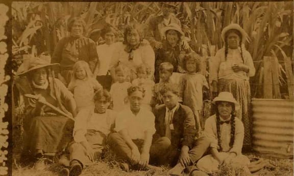 Postcard showing a group of unidentified Maori pose in front of flax bushes at Moutoa, 2 April 1916Foxton Centennial Celebrations Labour Weekend October 1955