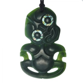 A Superfine Kahurangi Pounamu Hei Tiki. Meticulously carved with head tilted to the left, wide open pāua inlaid eyes, flared nostrils, heart-shaped mouth with tongue out and hands clasped to thighs.