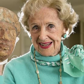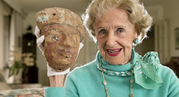 Joan Howard with mummy mask she found at ancient burial ground, Sakkara. Photo: Steve Ferrier