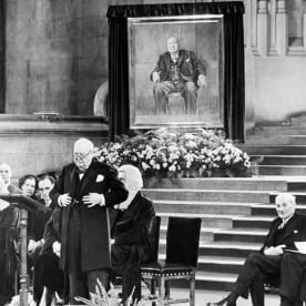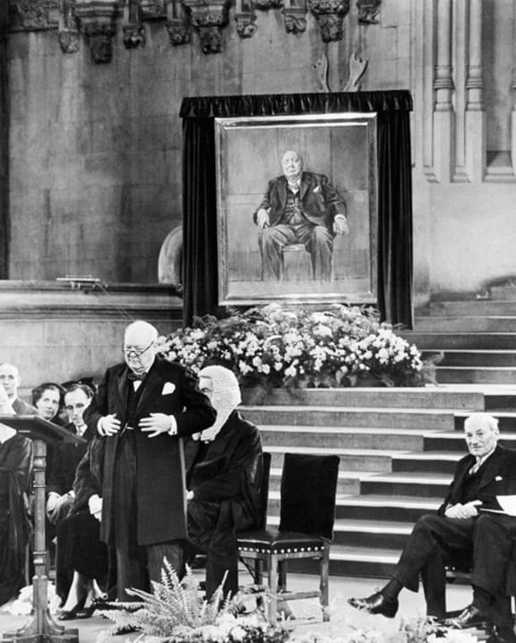 Winston Churchill at the reception of his portrait by Graham Sutherland at Wessminster Hall 30 November 1954